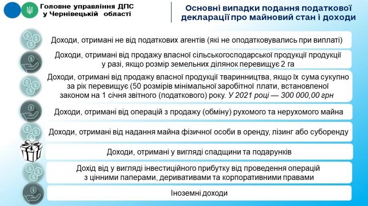 Фахівці Головного управління ДПС у Чернівецькій області роз'яснюють - Кампанія декларування триває. Податківці звертають увагу, що обов’язковому декларуванню підлягають: