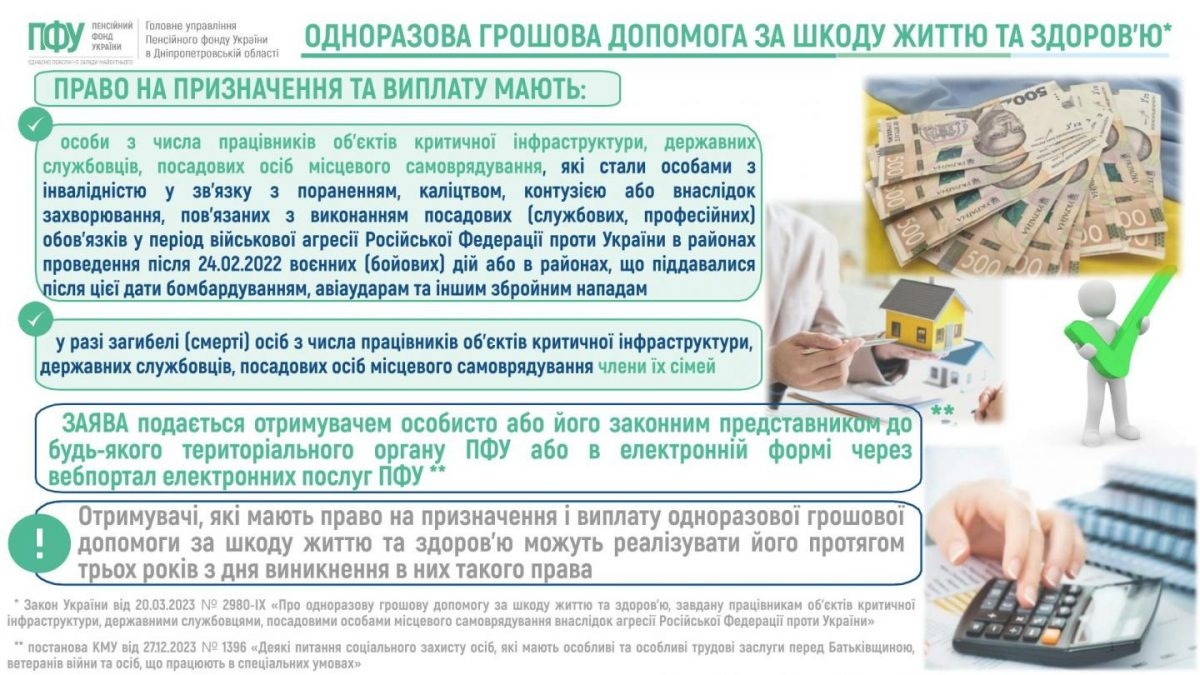 Відповідно до Закону України від 20 березня 2023 року № 2980-IX “Про одноразову грошову допомогу за шкоду життю та здоров’ю, завдану працівникам об’єктів критичної інфраструктури, державним службовцям, посадовим особам місцевого самоврядування внаслідок військової агресії Російської Федерації проти України” передбачено надання одноразової грошової допомоги за шкоду життю та здоров’ю внаслідок військової агресії російської федерації проти України.