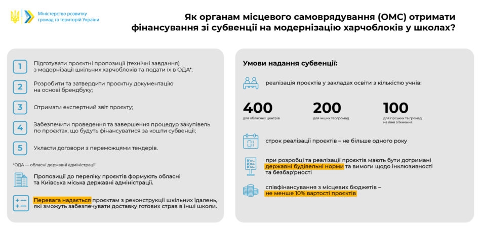 У Держбюджеті на 2022 рік передбачено субвенцію у розмірі 1,5 млрд гривень на модернізацію харчоблоків у школах. Для отримання фінансування органи місцевого самоврядування мають слідувати чітким вимогам, які були розроблені в Міністерстві розвитку громад і територій. Зокрема, йдеться про розробку проєктної документації та забезпечення норм інклюзивності та безбарʼєрності.