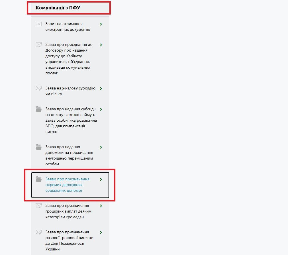 Крок 2. В особистому кабінеті на панелі ліворуч у розділі “Комунікації з ПФУ” оберіть опцію “Заяви про призначення окремих видів державних соціальних допомог”.