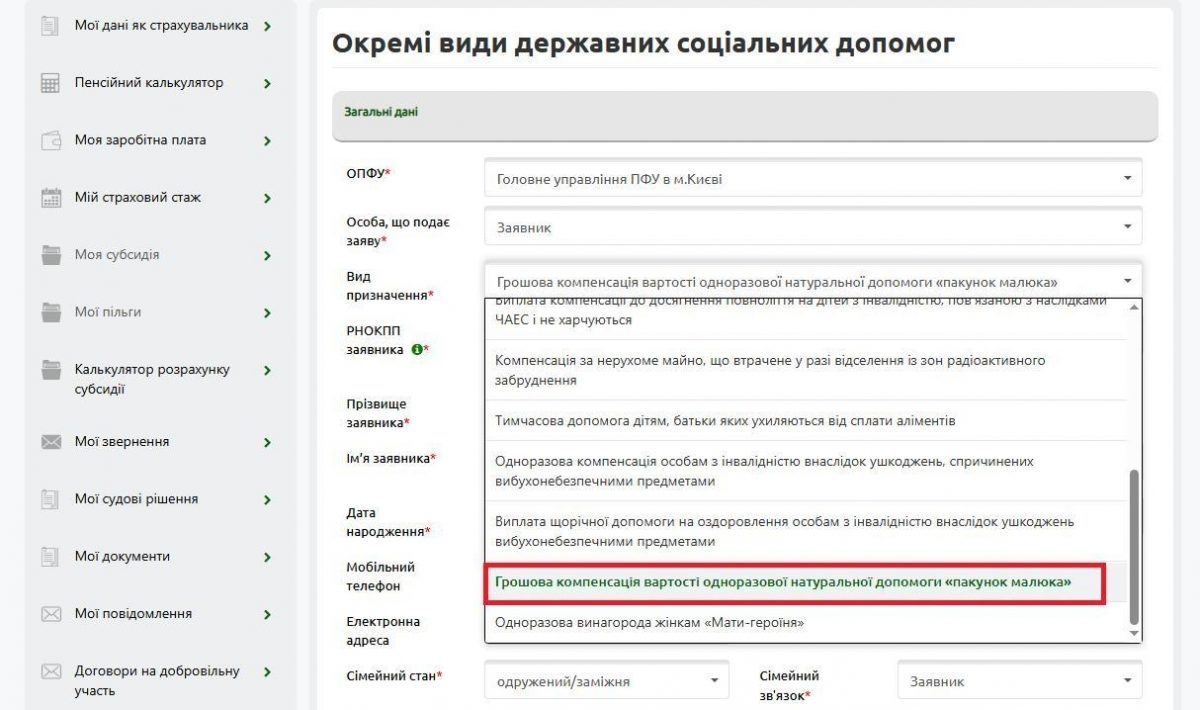Крок 4. Заповніть онлайн-форму заяви, що з’явиться на екрані. Зазначте назву обраного Головного управління Пенсійного фонду України. У полі “Вид призначення” оберіть рядок “Грошова компенсація вартості одноразової натуральної допомоги “пакунок малюка”.
