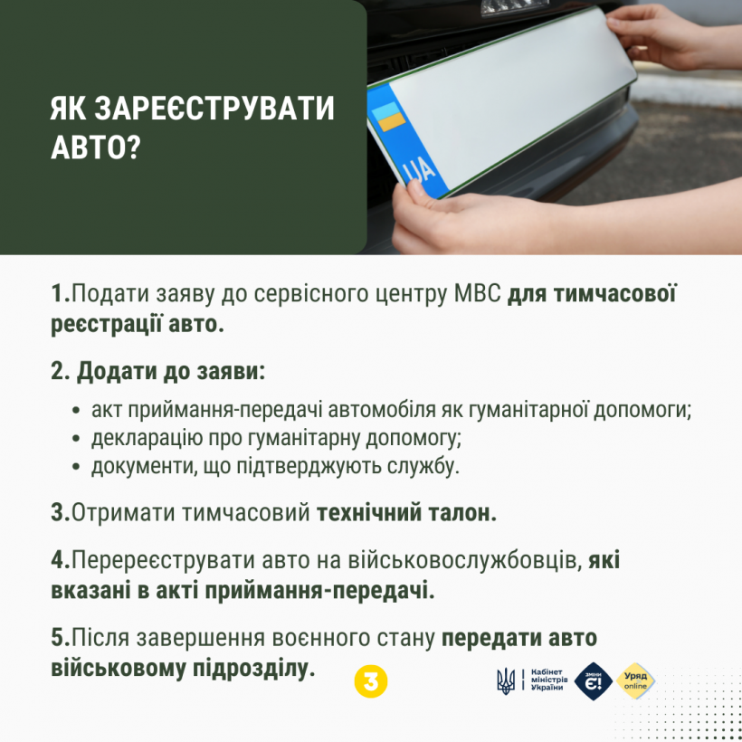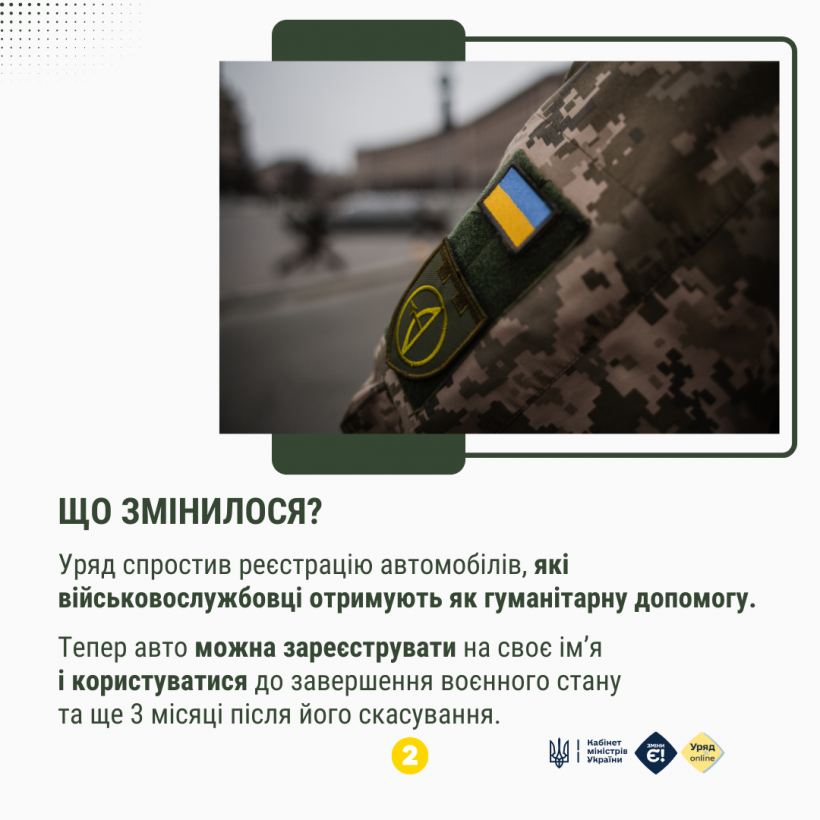 Уряд спростив реєстрацію автомобілів, які військові отримують як гуманітарну допомогу. Авто можна зареєструвати на своє ім’я та користуватися до кінця воєнного стану і ще 3 місяці після його