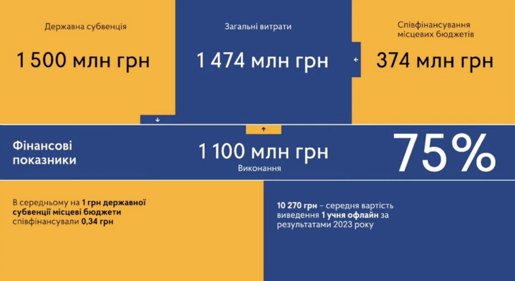 У 2023 році вдалося побудувати / відремонтувати 235 укриттів у закладах освіти, завдяки чому 143,5 тисячі школярів і школярок повернулися до офлайн-навчання. Середня вартість виведення одного учня в офлайн-навчання, за даними аналітиків, склала приблизно 10 270 гривень.
