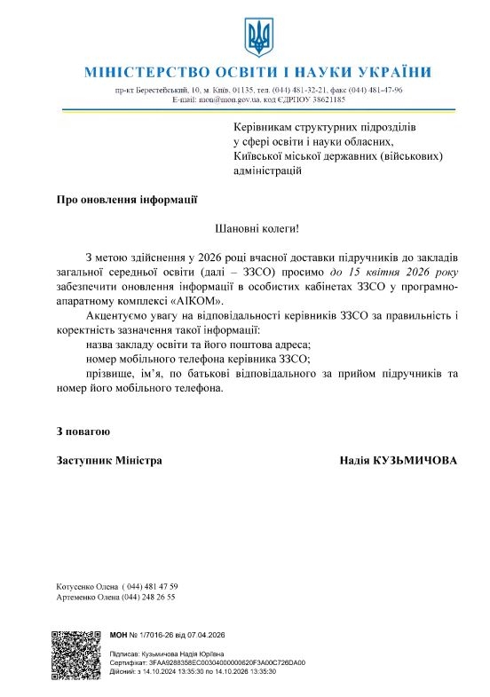 Керівники закладу несуть персональну відповідальність за правильність та актуальність зазначеної інформації, оскільки від цього залежить успішність доставки навчальних матеріалів.