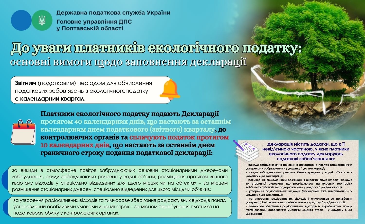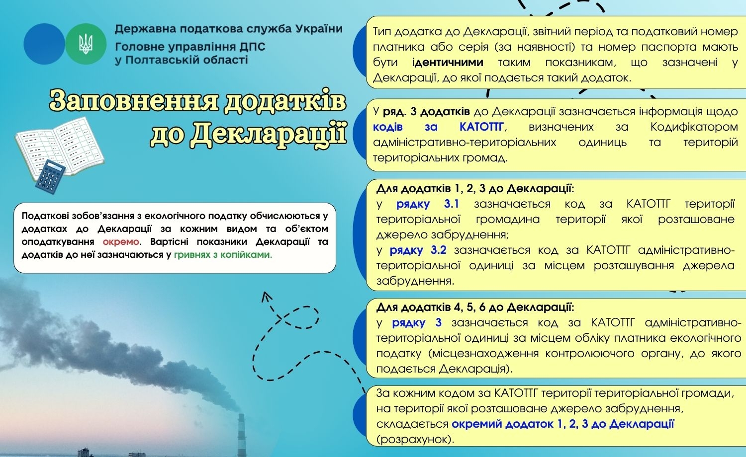 Головне управління ДПС у Полтавській області нагадує, що форма податкової декларації екологічного податку затверджена наказом Міністерства фінансів України від 17.08.2015 № 715, зареєстрований у Міністерстві юстиції України 03.09.2022 за № 1052/27497, із змінами (далі – Декларація). Декларація містить додатки, що є її невід’ємною частиною, у яких платники екологічного податку декларують податкові зобов’язання за: