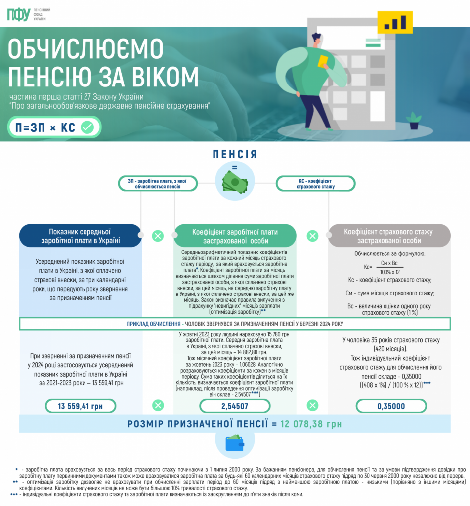 У 2023 році Пенсійний фонд України проілюстрував обчислення розміру пенсії за віком. Враховуючи, що зазначене інформаційне повідомлення протягом тривалого часу перебувало в “топі” рейтингових публікацій, наводимо приклад обчислення розміру пенсії за віком, яка призначається за зверненням у 2024 році.
