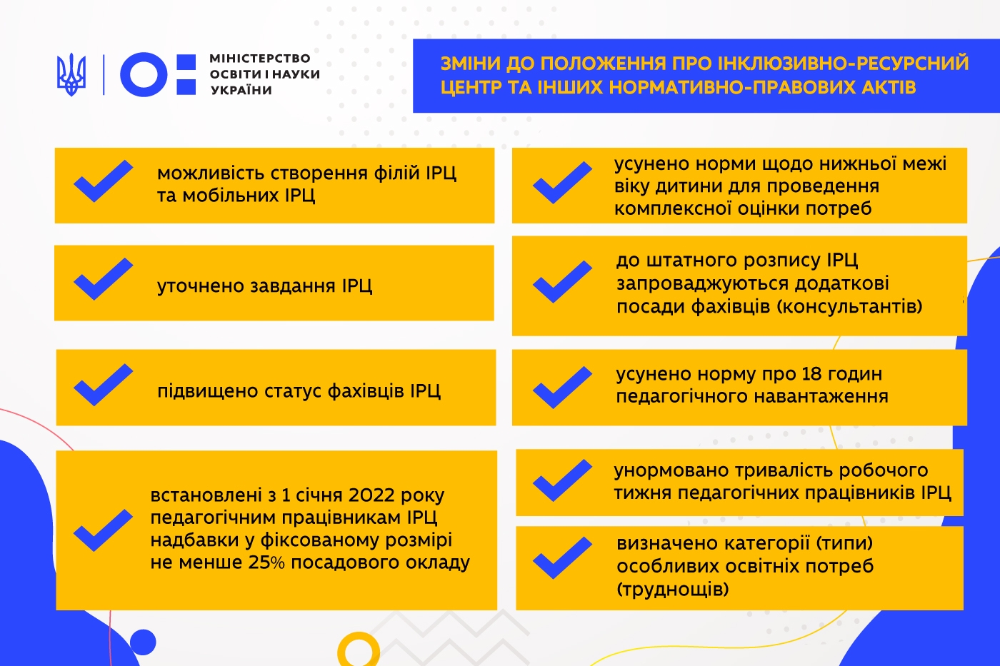 - Інклюзивно-ресурсним центрам дозволили мати філії та використовувати мобільні ІРЦ. Окрім того, кілька засновників можуть створити спільний ІРЦ.