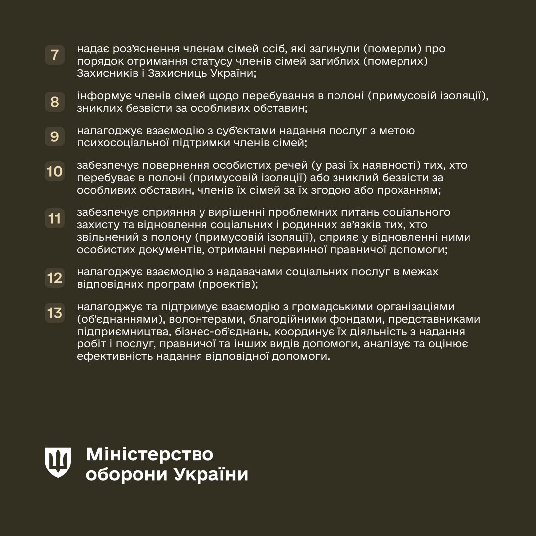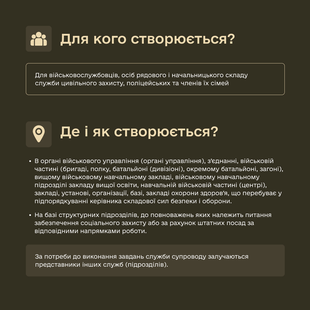 Такі служби опікуватимуться військовослужбовцями, особами рядового і начальницького складу служби цивільного захисту, поліцейськими та членами їх сімей.