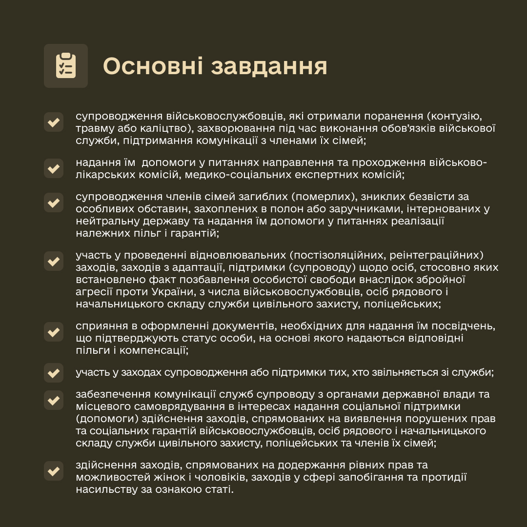 Основне завдання служб супроводу полягатиме у допомозі військовослужбовцям у вирішенні низки соціальних та медичних питань. Так, серед них: