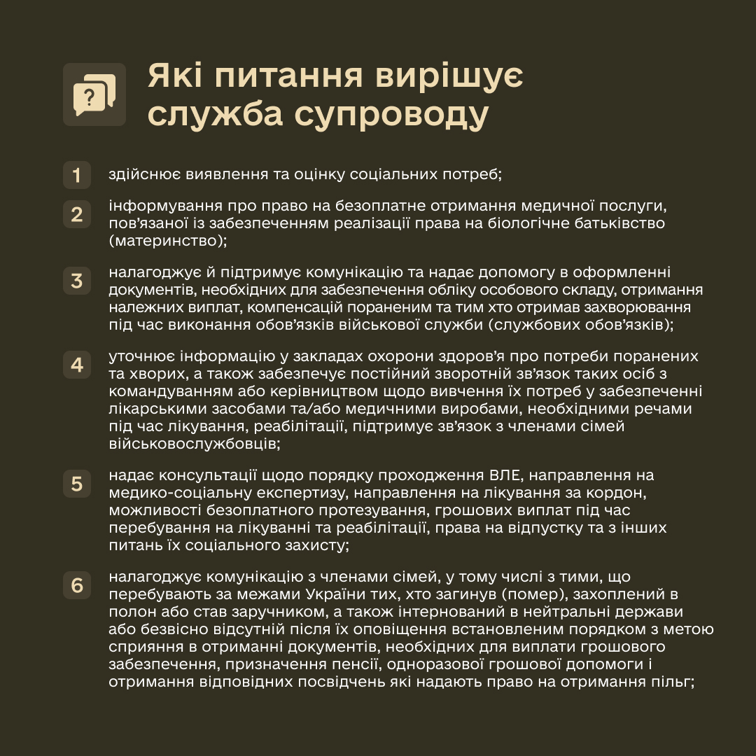 Уповноважені особи служб супроводу будуть виявляти та оцінювати соціальні потреби військовослужбовців та уточнювати інформацію у закладах охорони здоров’я про потреби поранених та хворих. Також вони будуть надавати всі необхідні консультації та забезпечувати «зворотній зв'язок» із надавачами соціальних послуг щодо вирішення актуальних питань військовослужбовців.